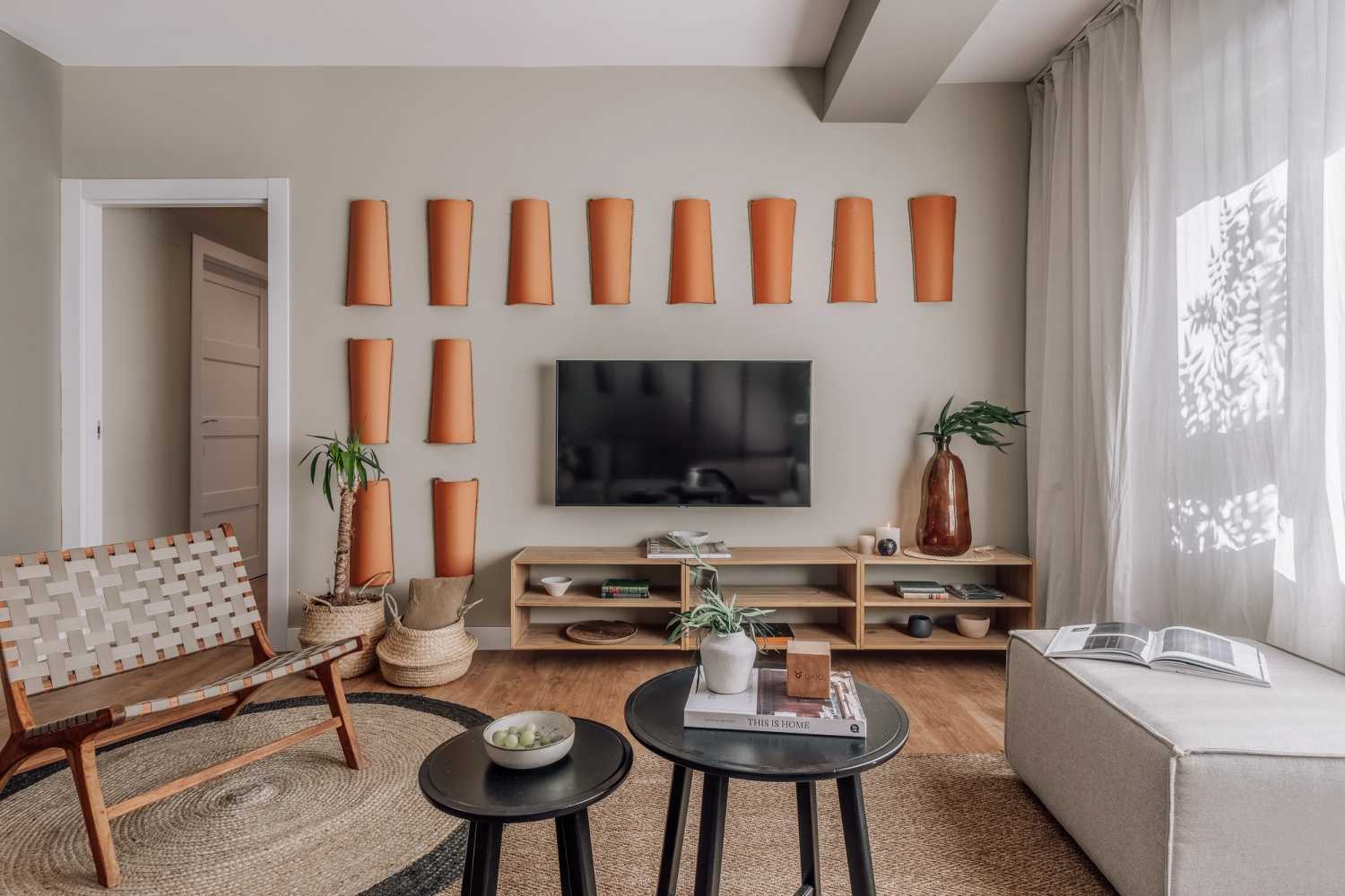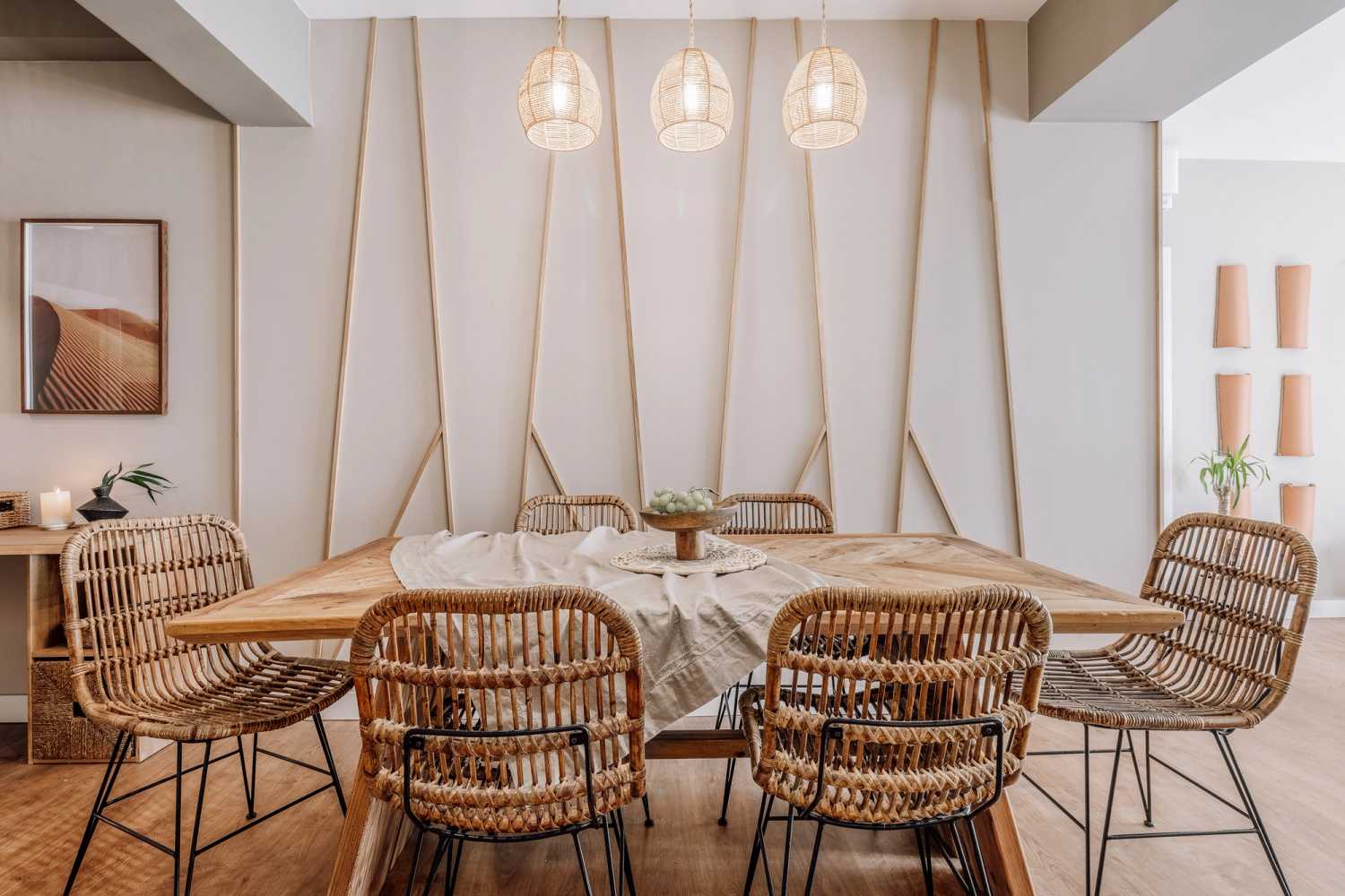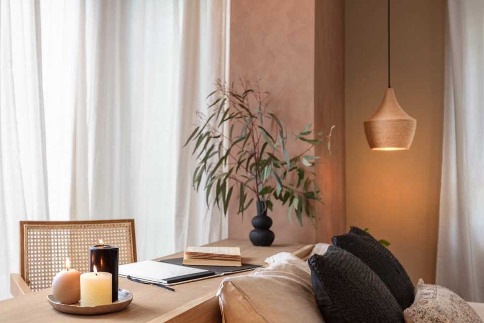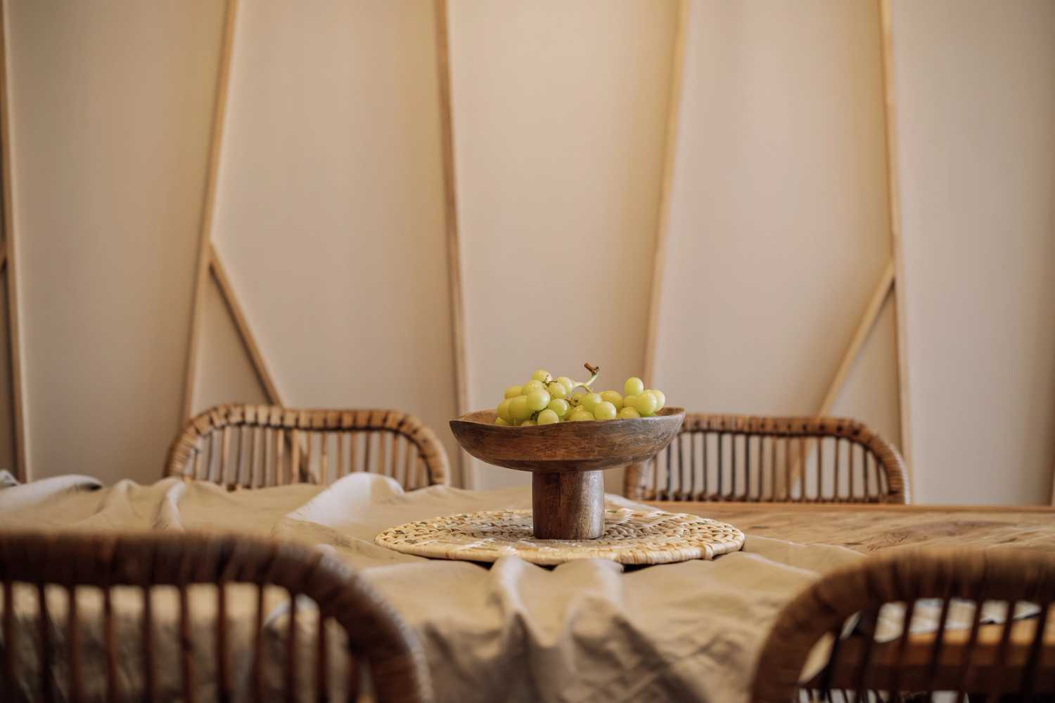 The main hall opens up to an elegant space fit for work and indulgence. The area closest to the entryway offers a spacious workstation for two complete with a vinyl record player. The middle of the space is fit for a glorious six-person dining experience with unique, lantern lighting hanging overhead. Terracotta details guide guests to the final area of the space: the living room. Here guests will find designer furnishings, desert-like greenery, and a full entertainment system.
