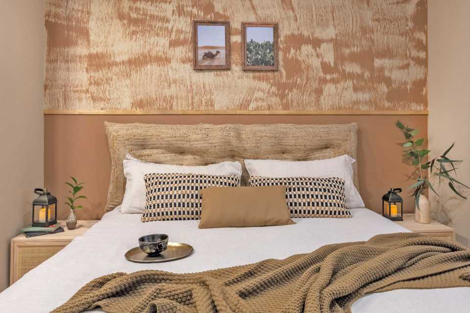 A glass door in the corner of the salon leads to the second hallway. The door to the immediate left leads to Smara’s first bedroom. A mix of earthy and organic textiles covers the queen-sized bed to create a Saharan ambiance. A full wardrobe occupies the left corner of the space.