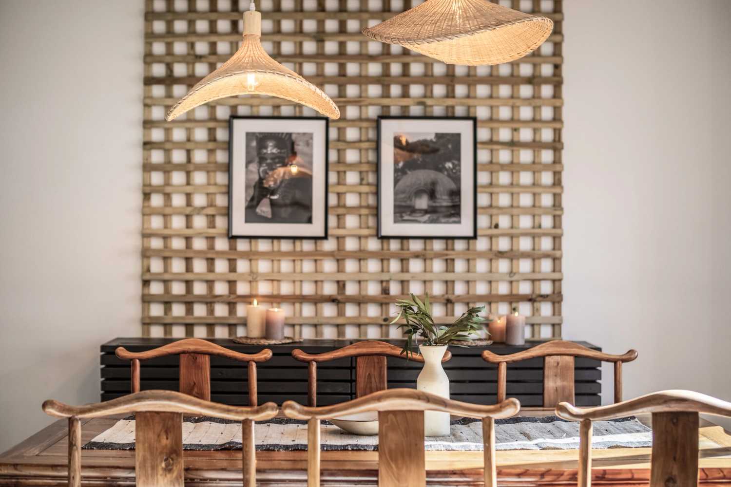 The entire space is illuminated with natural light. The open plan green-detailed kitchen is fully equipped with all cooking utensils and appliances, as well as a small kitchen bar. The dining area, fitted with a large dining table, has a custom made one-of-a-kind wooden ceiling piece adorned with plants. Adjacent to the dining table, find the lounge area with a large couch and a wooden chair.