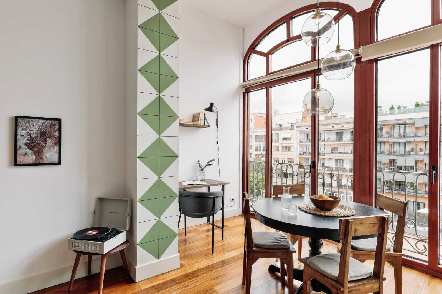 The patio has a dining area with unique hanging glass lamps and a round table. A dedicated work space has a desk and chair nestled against one of the patio walls.