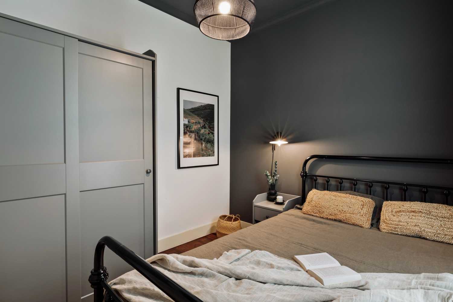 Upon entering the apartment, find the third bedroom past the entrance, fitted with a queen sized bed. Across the room, the kitchen, finished with black vinyls, is completely equipped with all cooking utensils and appliances. Down the hallway, a modern bathroom with a full shower.