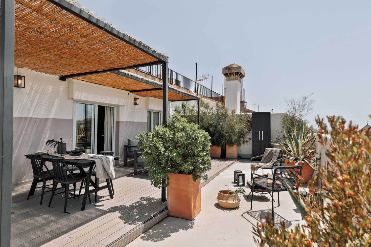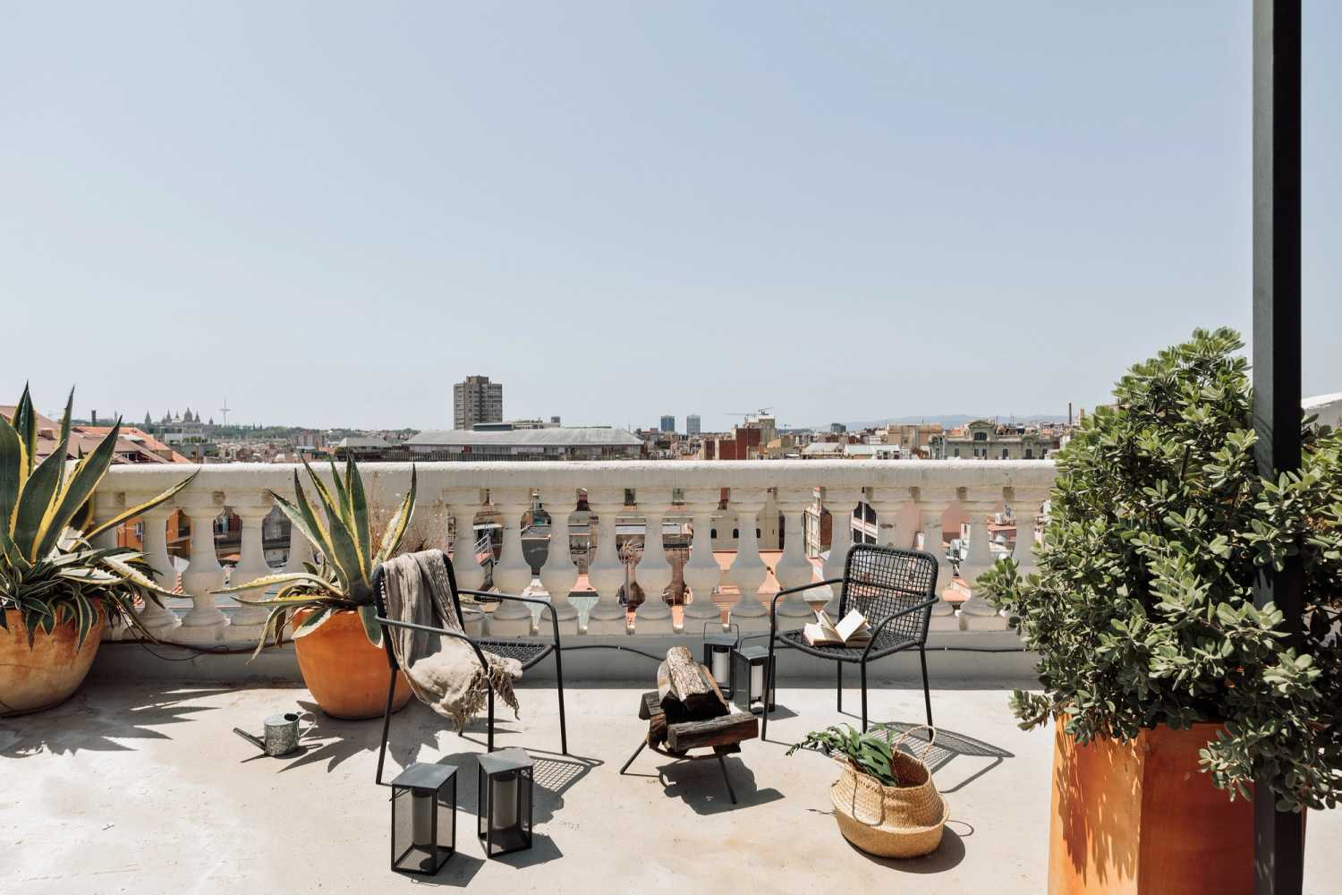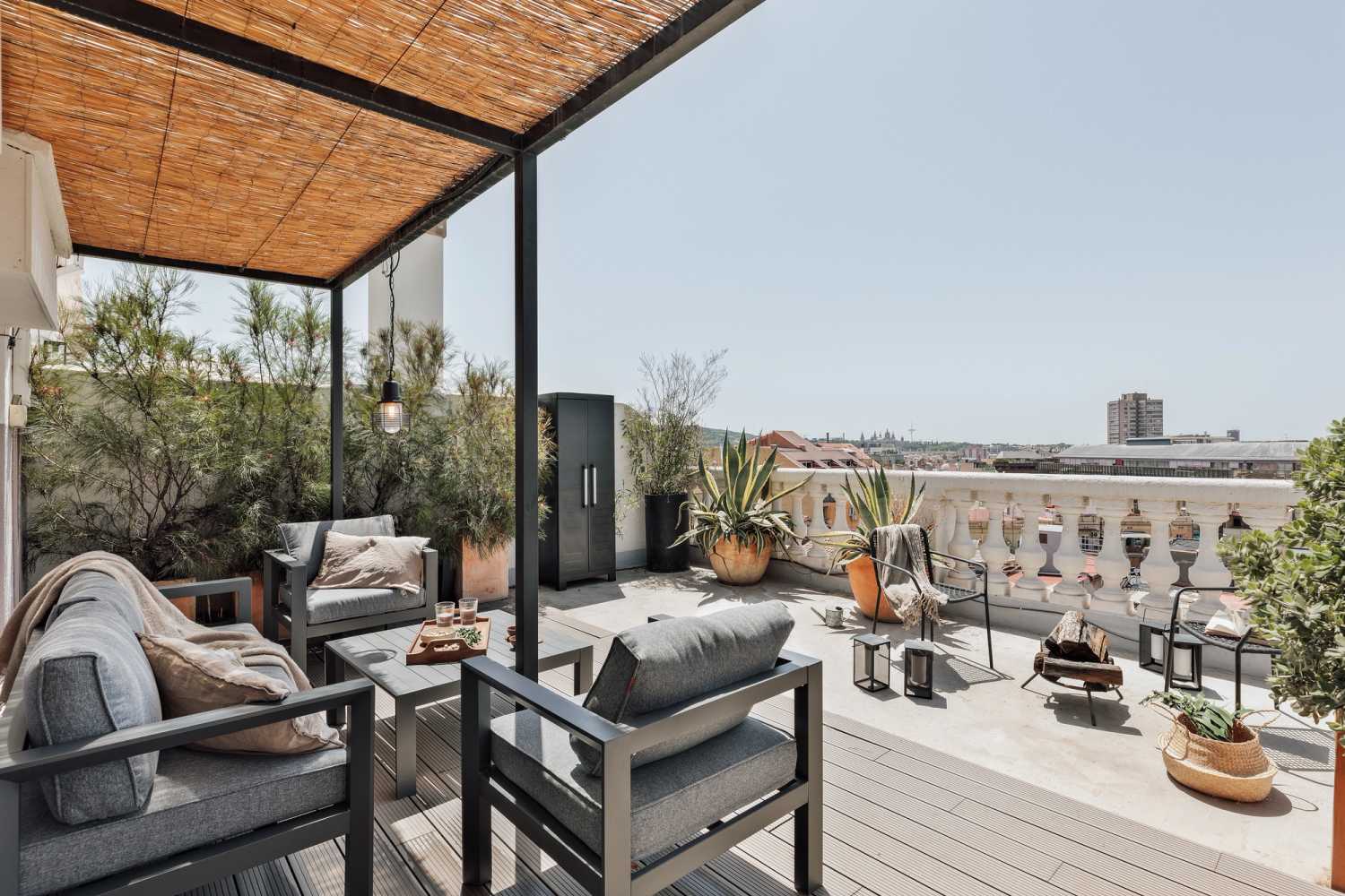 A rare find in the city of Barcelona, Fuji is a grandiose penthouse with a sprawling 57 square meter terrace with a view of the entire city. The 130 square meter apartment, flooded with natural light, has 2 bedrooms and 2 baths. The highlight of Fuji is the spacious terrace, which is fitted with an outdoor dining area covered by a bamboo pergola and two sun loungers.