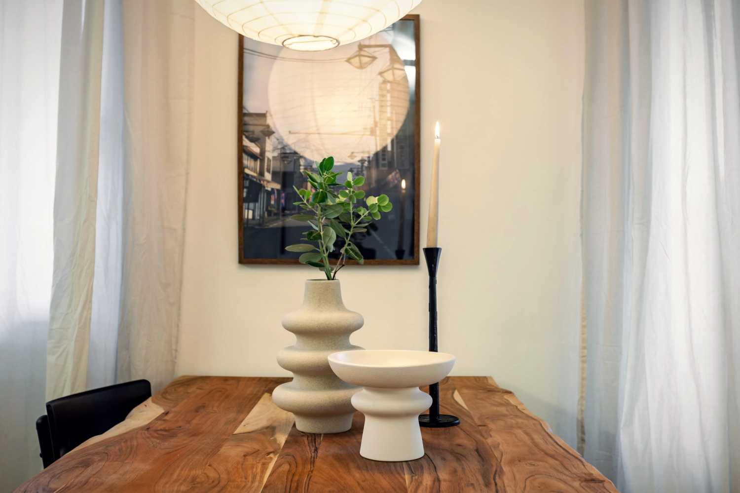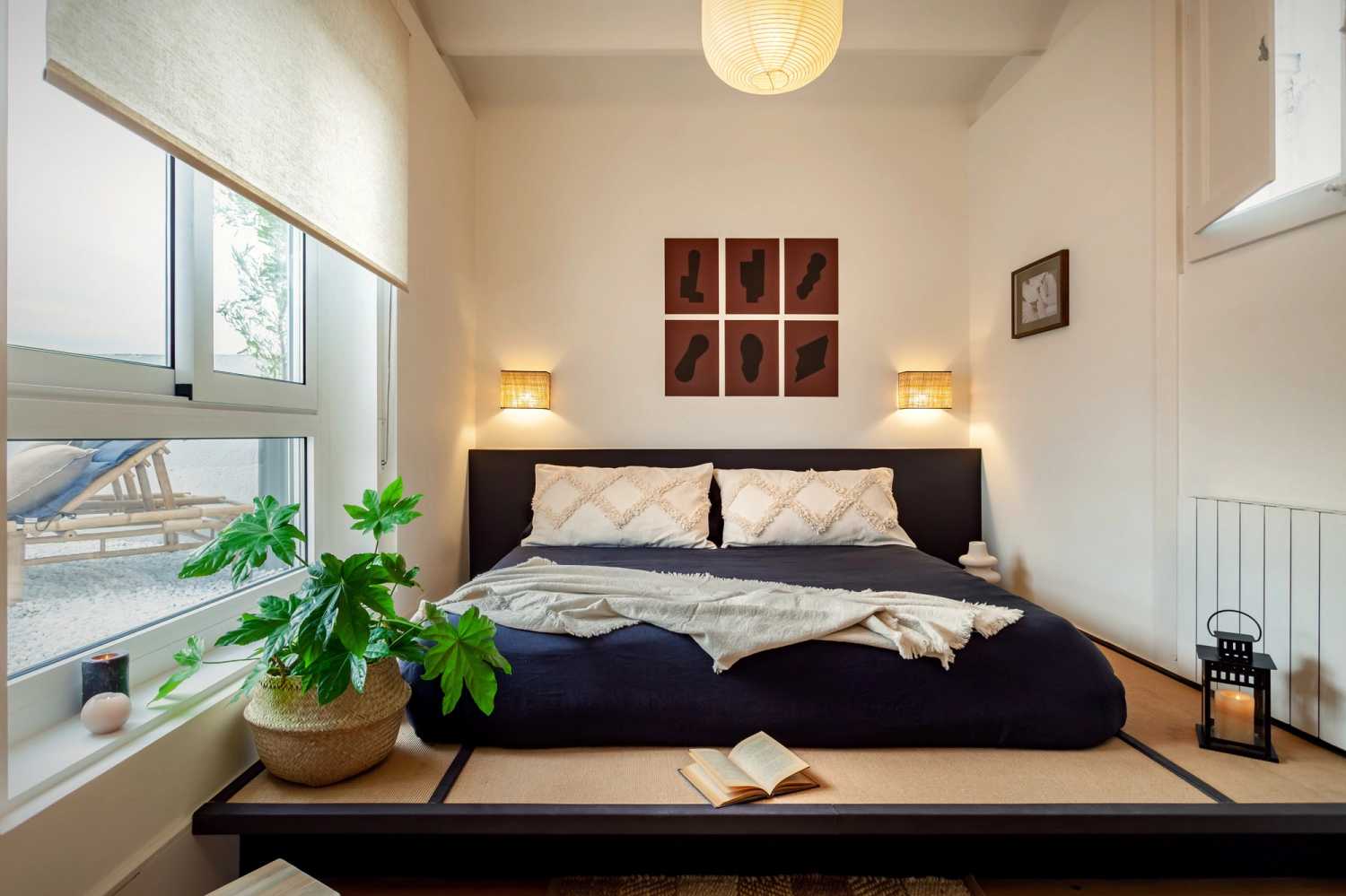 The living room area includes a comfortable lounge area facing the Smart TV, and dedicated work space with two chairs. One of the walls features an impressive simple decor with green leaves spilling over. A small hallway has a bathroom with a full shower. The second bedroom, with queen-sized bed and multiple closets, looks onto a small rock garden outside. For comfort, this apartment comes equipped with air conditioning in the Living Room and in one Bedroom. All bed and bath linens are provided.
