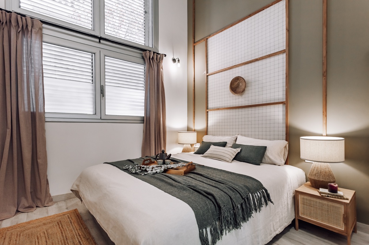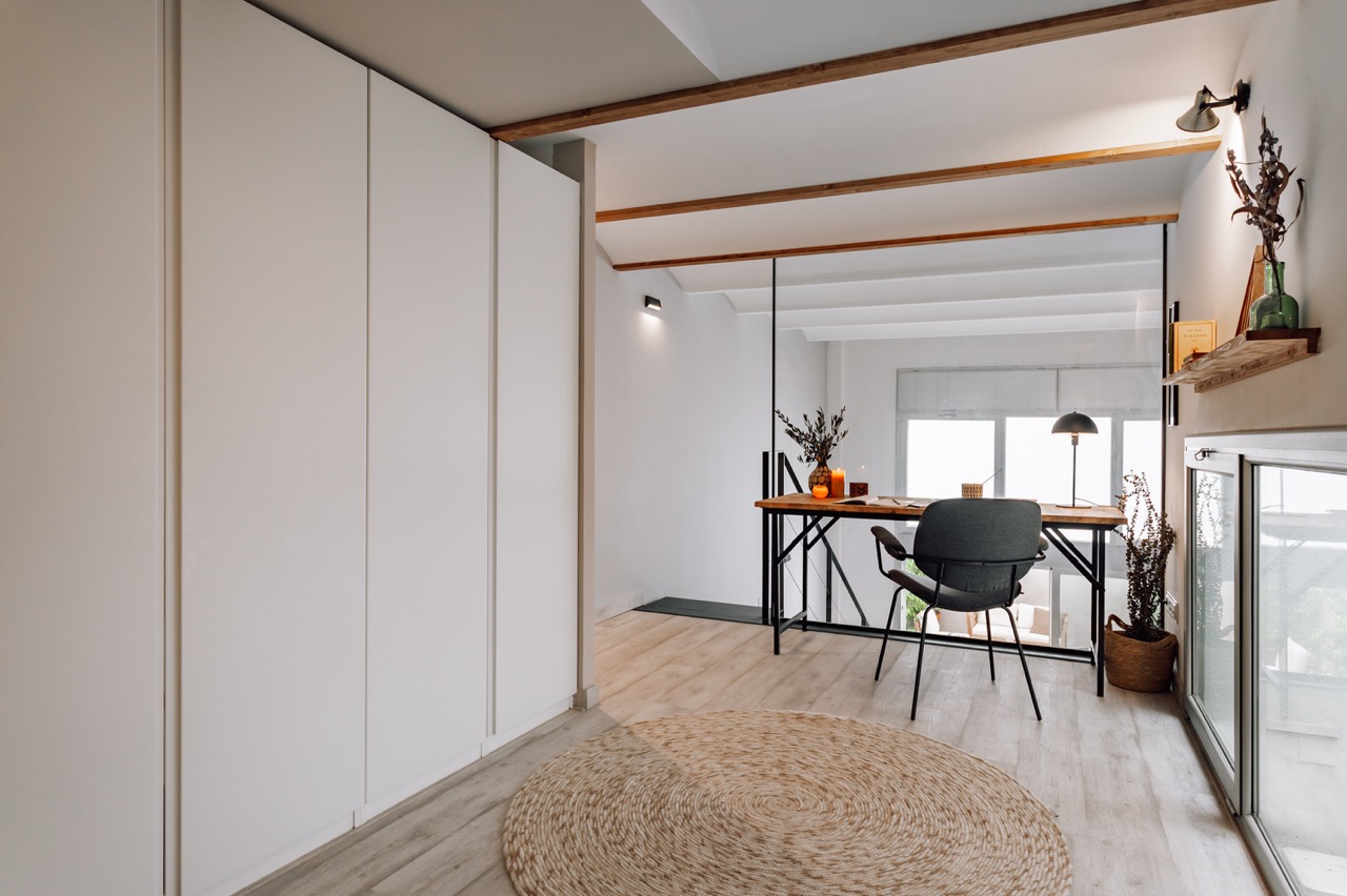 The kitchen, living and dining areas make up one magnificent open plan space, with 3 distinct areas. The fully-equipped kitchen is stylish, modern, and spacious. The dining area benefits from natural light flooding in from full length windows, as does the comfy living space, which leads out onto the enormous terrace. Furnished with both dining table and lounge seating area, Rute’s terrace is the perfect way to take advantage of the beautiful Catalan weather.